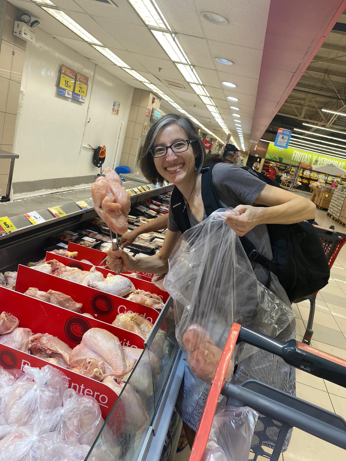 We got to Los Olivos (by bus!) early (!) on Sunday, so I took one team member with me to a nearby supermarket to buy the meat before church (we hadn’t wanted to risk it spoiling on the way). I told the woman behind the meat counter how many kilos of chicken breasts I wanted; she handed me a rather hefty meat fork and indicated that I could stab away!